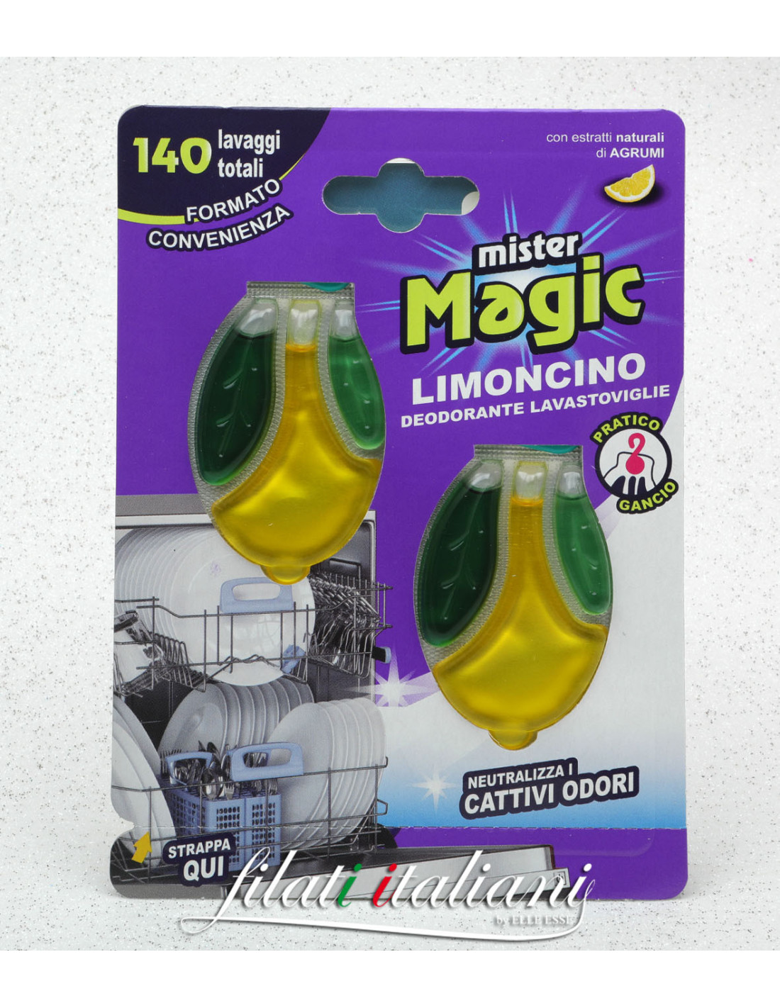 Дезодорант для посудомоечной машины, нейтрализующий неприятные запахи, работает и при выключенной посудомоечной машине. Гарантирует приятный аромат лимона на 70 циклов мойки (для каждого Limoncino). Оснащен практичным крючком для удобного размещения в посудомоечной машине. Формат : 6 + 6 мл